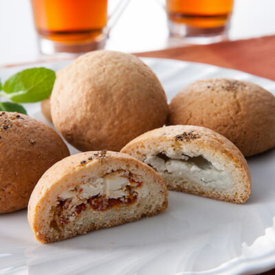 「大人のチーズまんじゅう レッド」はゴルゴンゾーラを使用したクリームチーズに、宮崎県都農町産「ごとくま」のドライトマトを練り込み、チーズのコクとトマトの甘みが絶妙の一品です。