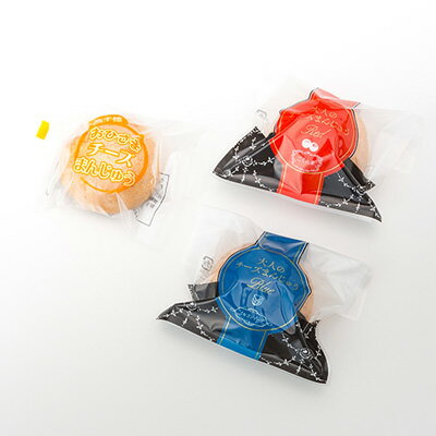 【「おひさまチーズまんじゅう」「大人のチーズまんじゅう ブルー」「大人のチーズまんじゅう レッド」の3種のセットです。